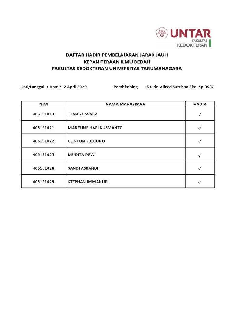Daftar Hadir Pembelajaran Jarak Jauh Kepaniteraan Ilmu Bedah Fakultas Kedokteran Universitas Tarumanagara
