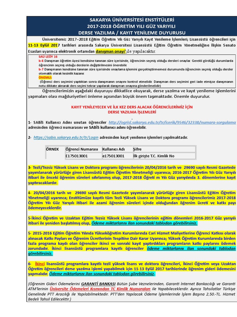 Sakarya Universitesi Enstituleri 2017 2018 Ogretim Yili Guz Yariyili Derse Yazilma Kayit Yenileme Duyurusu